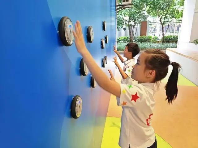 学校虽小,但角角落落却不少。除了地面上多出来的“跳房子”,体育老师们还不断在校内深挖资源空间,为学生设计小场地、小强度的运动和游戏。通过问卷,老师们了解到,孩子们偏爱玩摸高,于是,学校在每个楼面设置了高度不一的卡通摸高器,发展学生跳跃能力的同时,鼓励孩子们在课间多走出教室动一动、跳一跳。